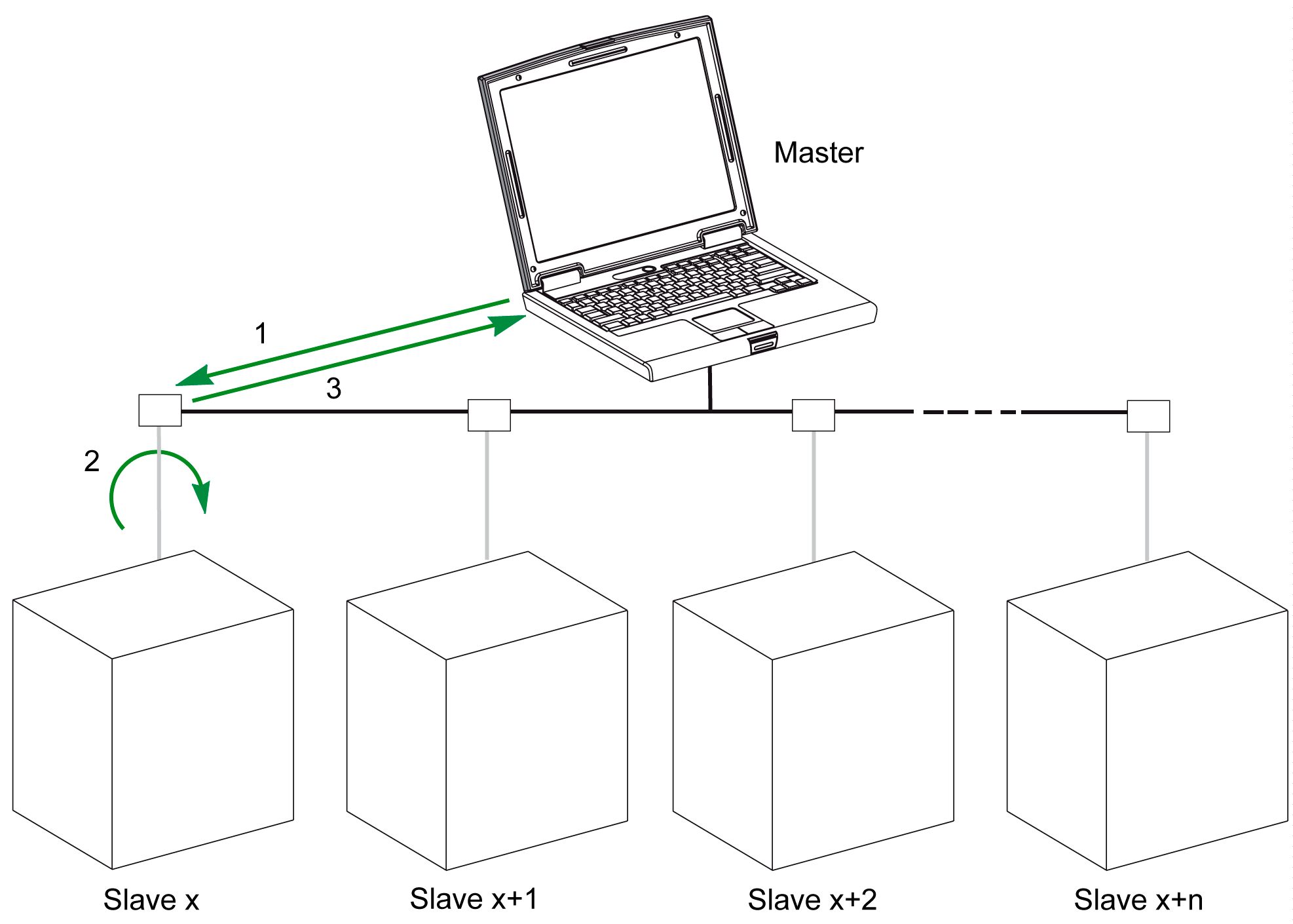 The Modbus protocol exchanges information using a request-reply mechanism between a master (client) and a slave (server). The master-slave principle is a model for a communication protocol in which one device (the master) controls one or more other devices (the slaves). In a standard Modbus network, there is 1 master and up to 31 slaves.