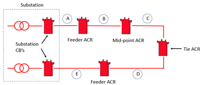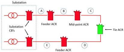 Similarly, supply is also lost to one side of the Tie ACR which now closes according to RULE C, and restores supply to the un-faulted B and C sections.