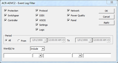 Using this dialogue, filters can be applied according to the Sources of the events, the time period the events occurred or any words to include or exclude. AND and/or OR logic can be applied to entered words.