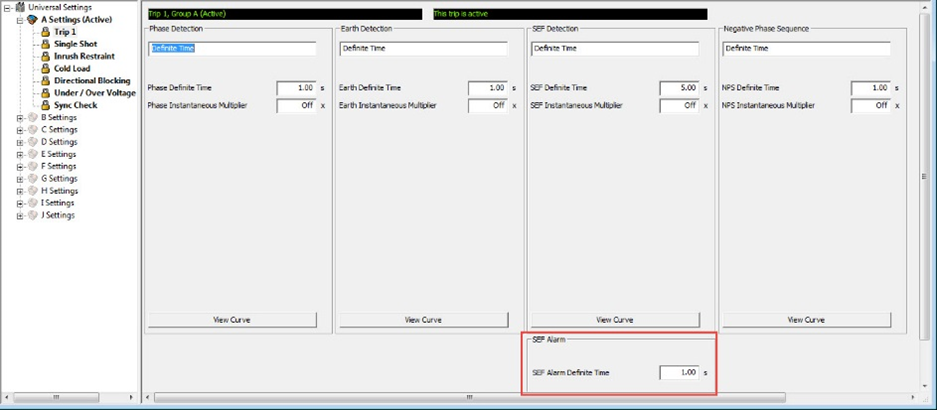 There are separate SEF Alarm Definite Time settings for Trip 1 and Single Shot within each detection group.