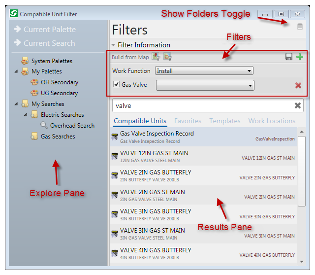 The Compatible Unit (CU) Filter  tool offers a means to easily navigate CUs using various filters. The CU filter consists of an expandable Explore pane, the Results pane, and a set of filters. The Explore pane lists the available searches and palettes. You can cycle the Results pane visibility using the Show Folders toggle. The Results pane displays the results of searches as well as the contents of palettes. Use the Filters section to modify what is shown in the Results pane.