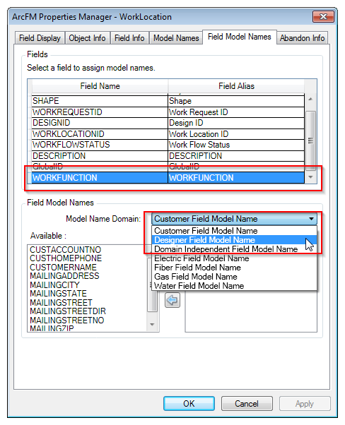 - On the Field Model Names tab, click on the WORKFUNCTION field.