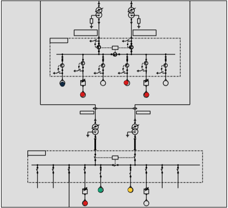 This feature offers users a way to visualize assets in a diagram layout. This functionality is particularly valuable for visualizing and analyzing asset relationships within an electrical substation, structure, or building. The drawing follows a color and shape schema that represents the associated risk levels and asset types.