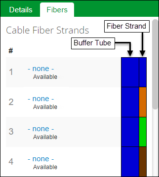 If the cable uses a buffer tube > strand arrangement, the tab displays the buffer tube color first followed by the fiber strand color: