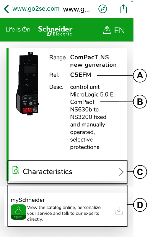 Seleccionar este menú permite acceder a una hoja de datos del producto con información detallada sobre la unidad de control MicroLogic.