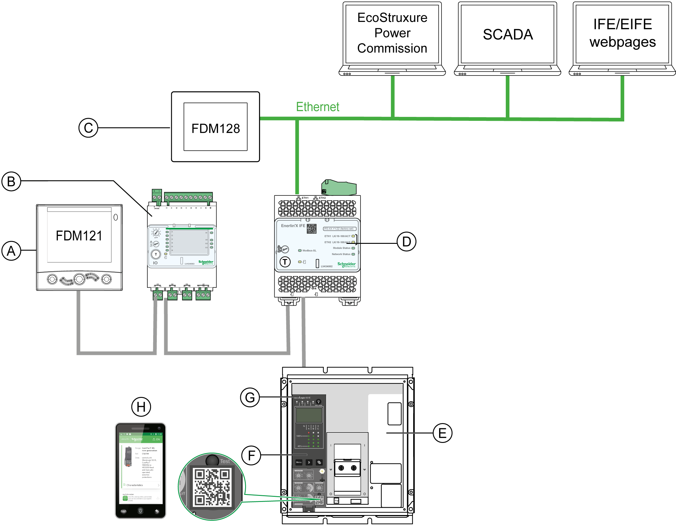 Una red Ethernet con protocolo Modbus TCP/IP a través de una interfaz IFE Ethernet para un interruptor automático o un servidor de panel IFE Ethernet