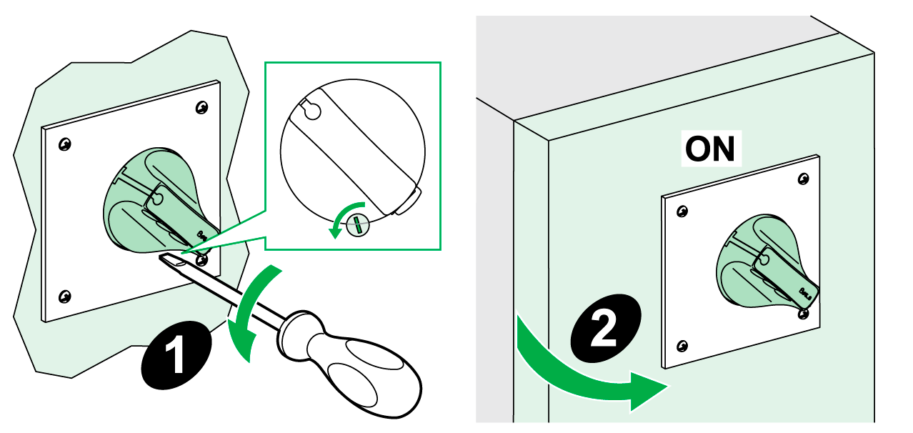 锁门设备还可以有助于防止直接旋转手柄在在柜门打开时移动到 I (ON) 位置。