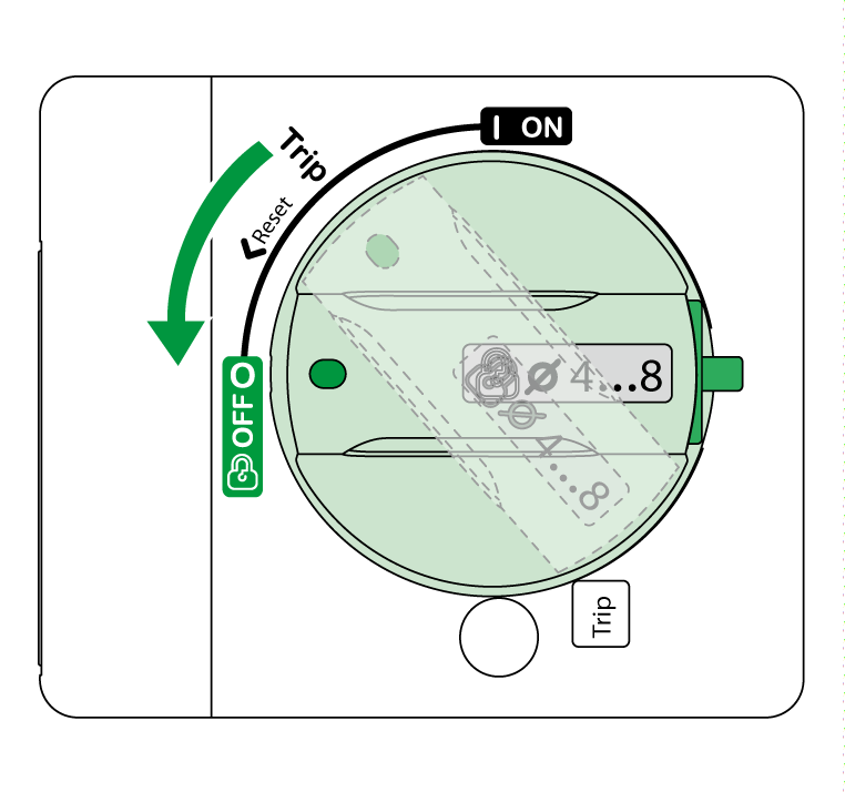 Gire el mando rotativo de la posición Trip a la posición O (OFF). El interruptor automático se restablece y se abre. |