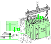 利用合适的起吊设备,将设备安装在延伸导轨上。 确认设备两侧的四个轮子位于导轨上。 |