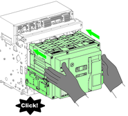 在连接或断开抽出式设备时,需要插入摇进摇出手柄。若已利用钥匙锁、挂锁或开门锁将抽架锁定到位,则无法插入摇进摇出手柄。