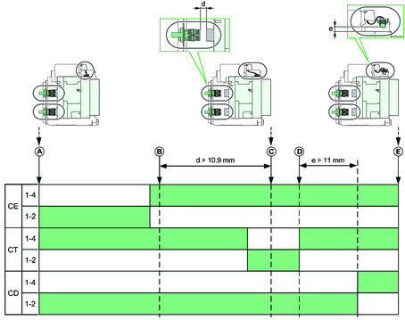 在摇进摇出操作期间,位置触点的状态根据设备位置改变,如下图所示。