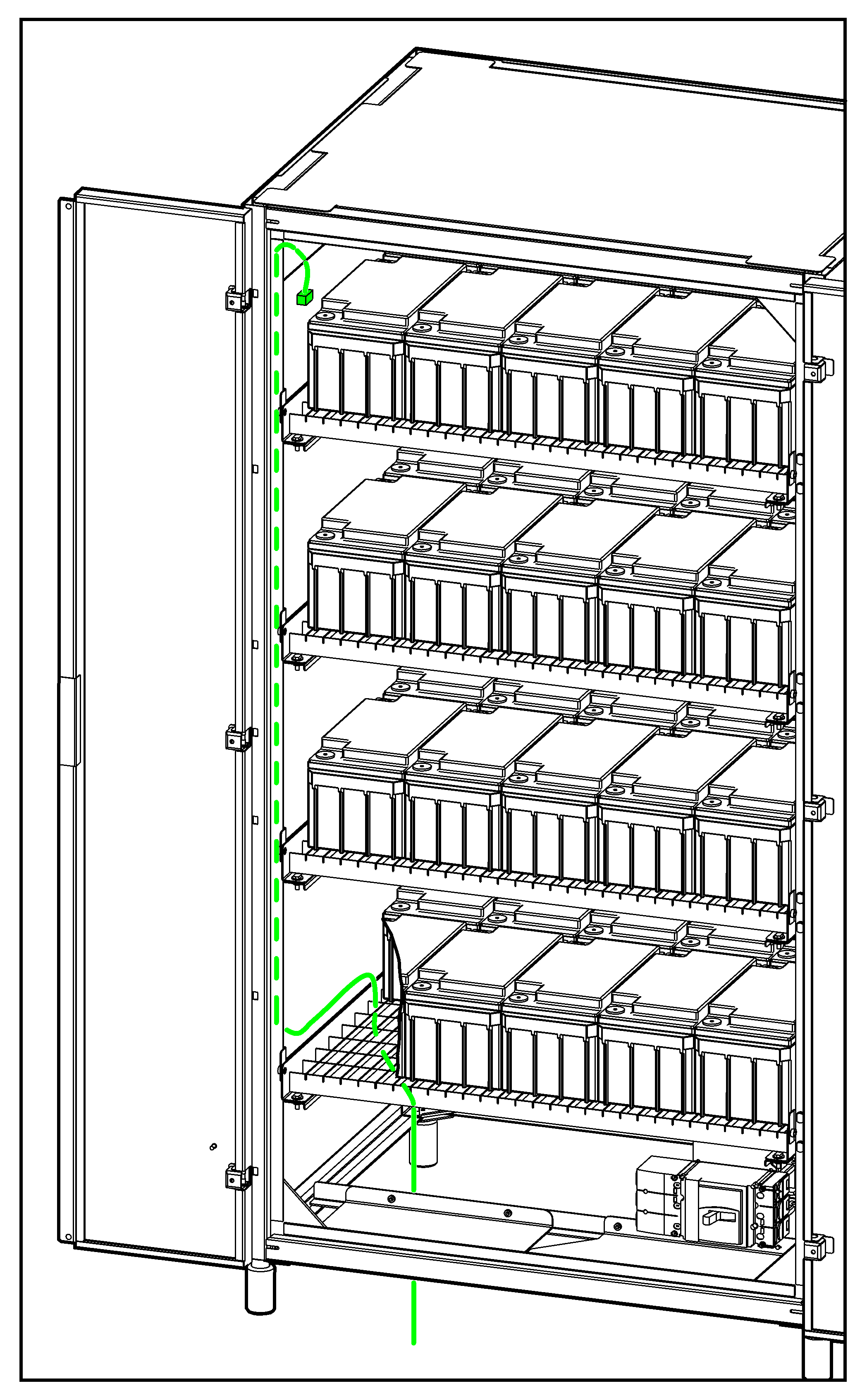 5. Проложите сигнальные кабели через заднюю часть шкафа батарейного автомата, а затем через низ шкафа для стандартной батареи.