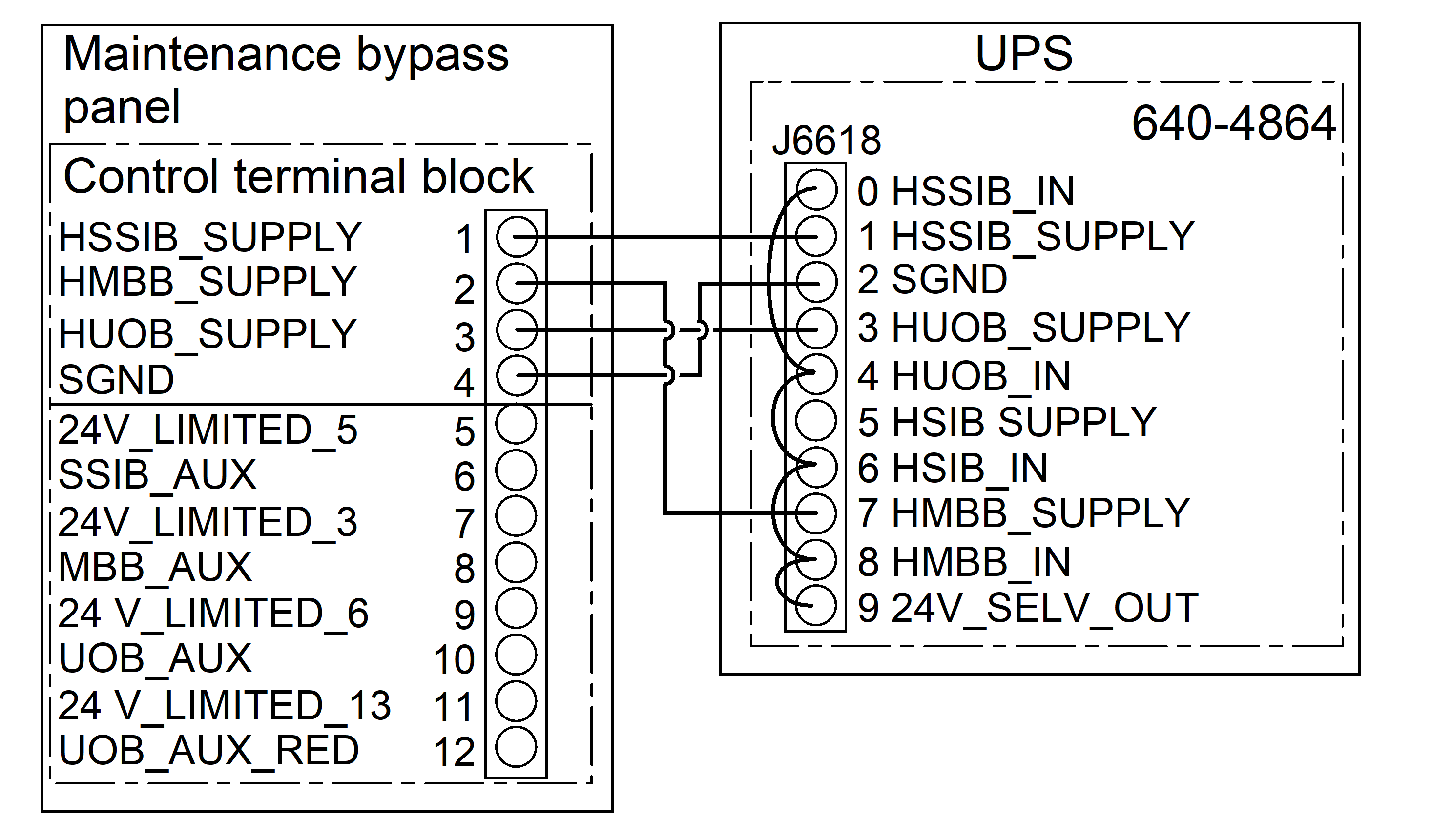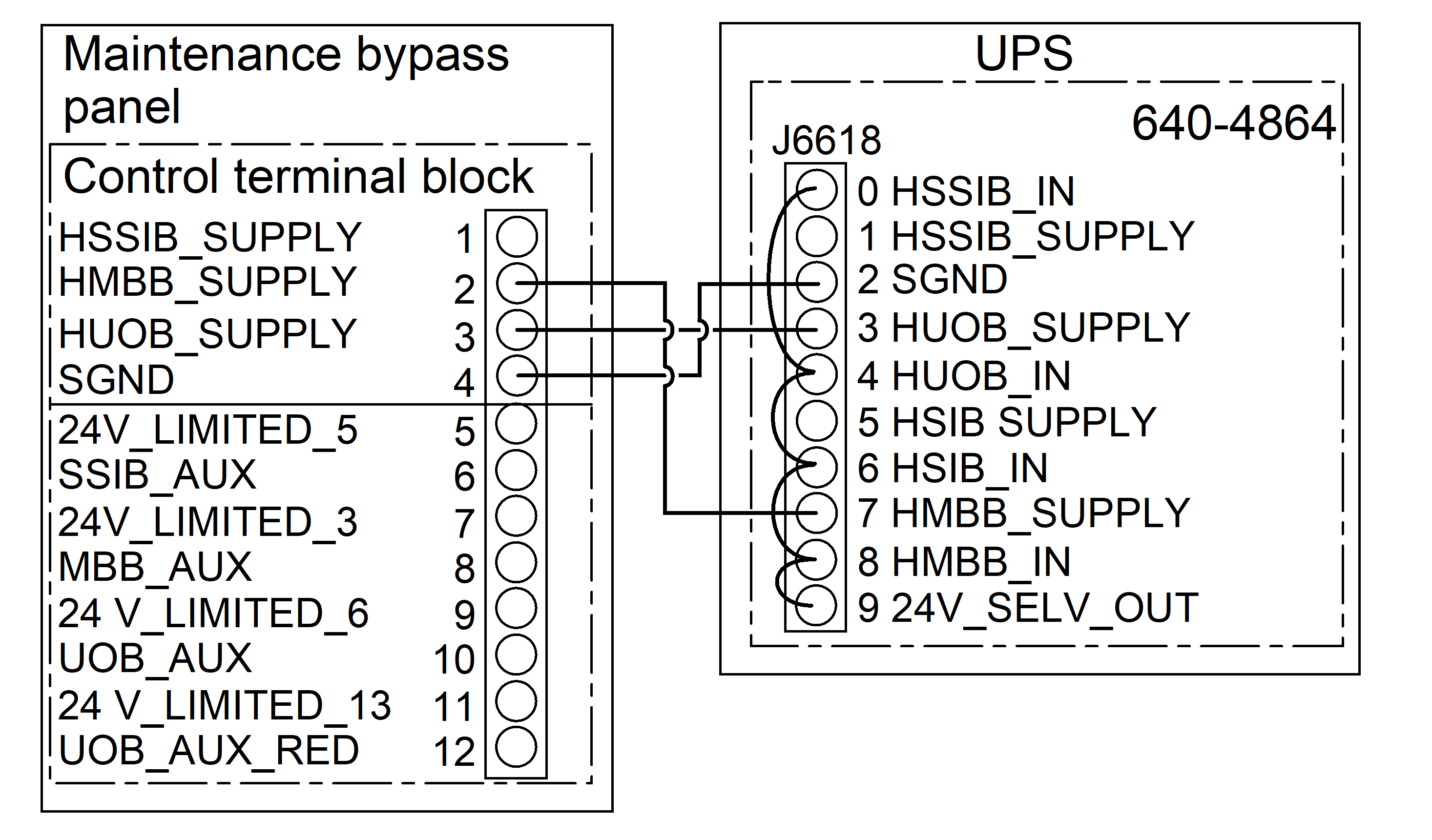 2. Connect the non-Class 2/non-SELV signal cables from the control terminal block in the maintenance bypass panel to the UPS as per your configuration.