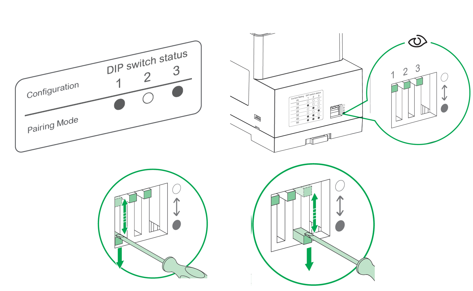 På EVA2HPC3-modulen: Før paringen er gjennomført, endrer du strømstyrken med DIP-bryteren for å avbryte.