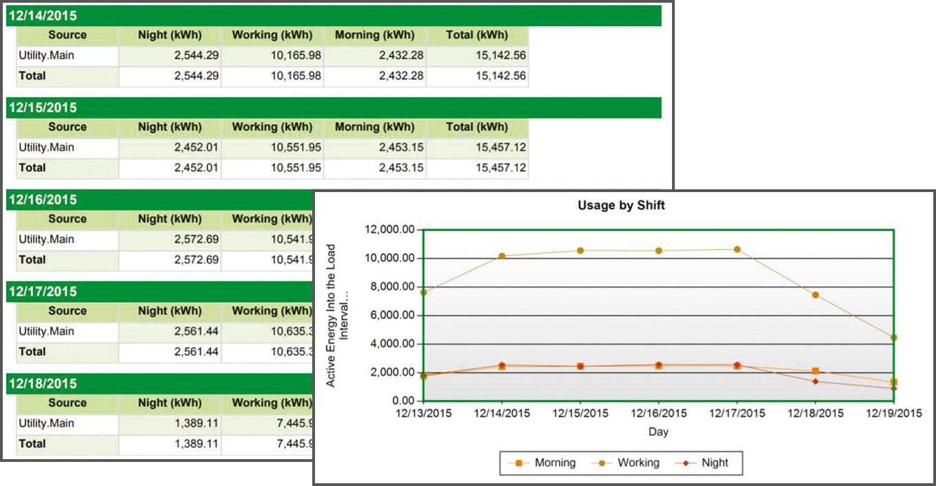 Compares a measurement from multiple devices for specified time periods (or shifts). This means energy usage can be compared between shifts (for example, 6:00 to 1:00 vs. 1:00 to 8:00).