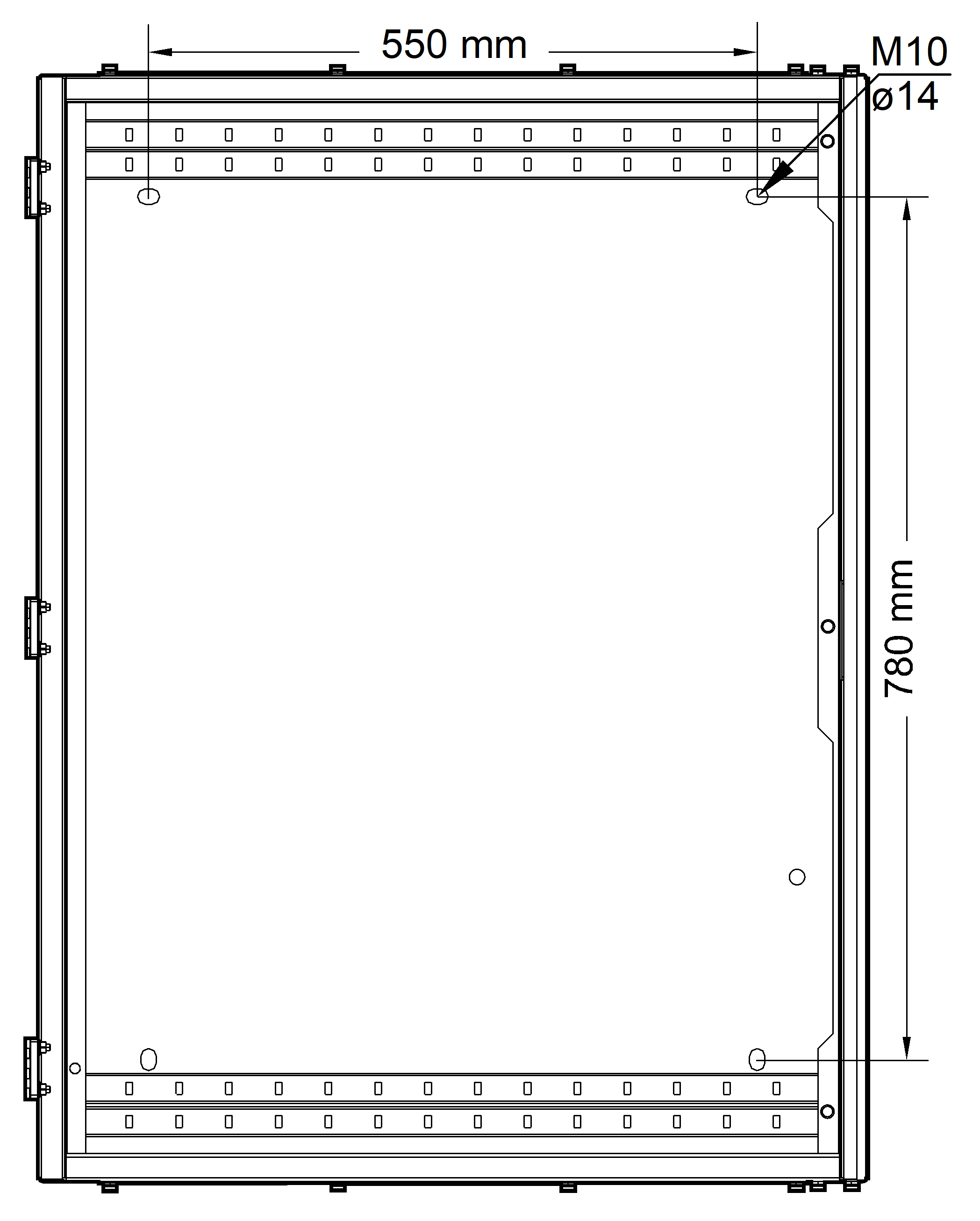NOTE: Quatre écrous et vis Torx M10 x 30 sont fournis pour la fixation du coffret disjoncteur batterie sur un rack.