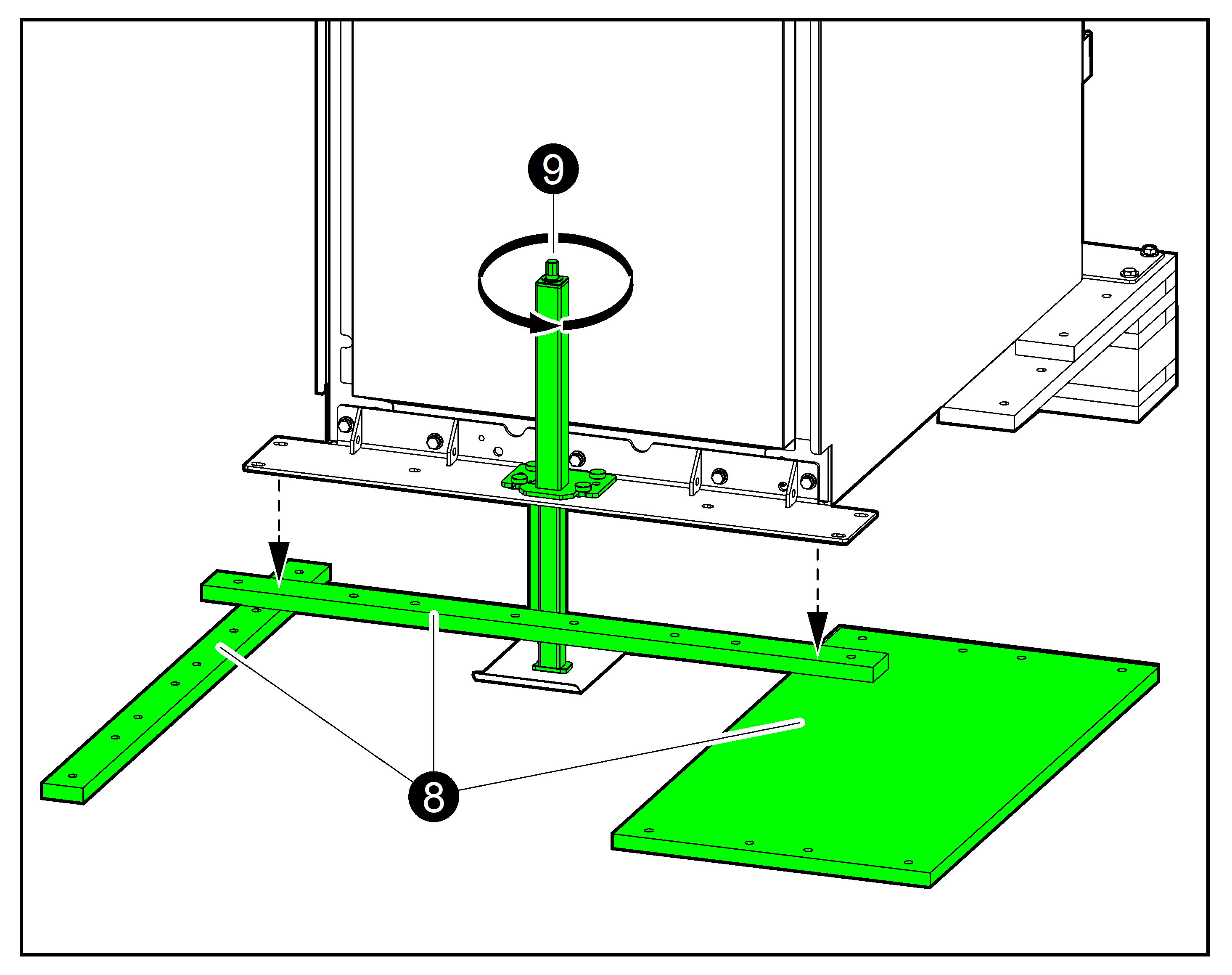 - Weź zestaw montażowy 0M-816661 dostarczony wraz z szafą we/wy. Podnośnika i płyty zabezpieczającej podłoże w zestawie należy używać w przypadku wszystkich szaf opisanych w tej procedurze.