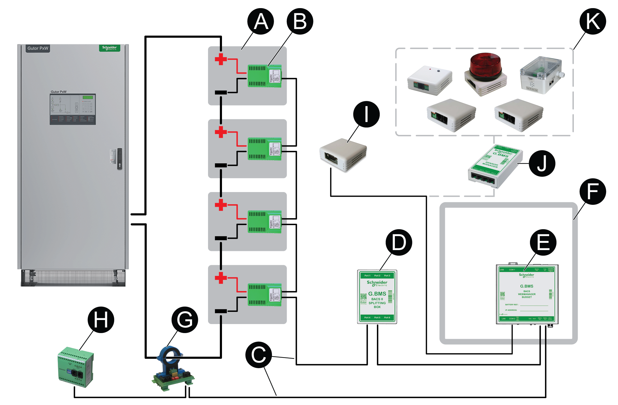 - (C) Bus cables: Bus cables connects all the parts in the solution with each other. One webmanager is connected to one bus, additional webmanagers can be used if there are multiple battery banks for example in a redundant Gutor system. For long distances between devices, repeaters can be used to extend the bus.