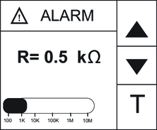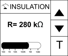 The default screen shows the insulation resistance value of the system. It is automatically replaced by a screen that notifies an insulation alarm. The screen backlight flashes to indicate an insulation alarm.