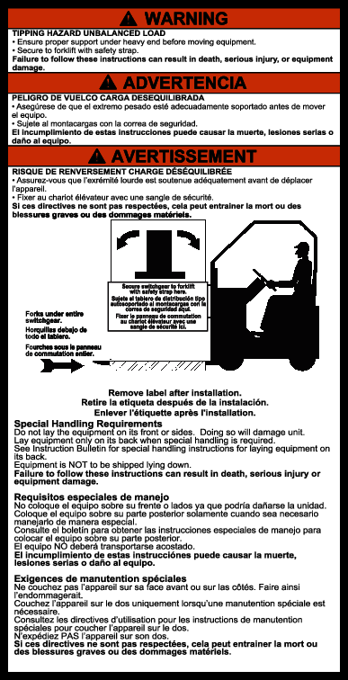 Lifting eyes are not furnished on skid mounted or outdoor subassembly. Use rollers, slings, or other means to handle the shipping sections. The handling label (see Handling Instruction Label-Switchboards without Lifting Straps) is affixed to each of these sections.
