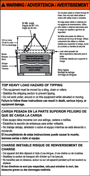 Des anneaux de levage ne sont pas fournis sur les sous-ensembles montés sur palettes ou pour usage à l’extérieur. Des rouleaux, élingues ou autres moyens doivent être employés pour la manutention des sections d’expédition. L’étiquette de manutention (voir Étiquette de directives de manutention – Tableaux de distribution sans sangle de levage) est placée sur chacune de ces sections.