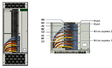 En una configuración con dos kits de zapatas de alimentación secundaria, habrá dos conjuntos de zapatas por fase (por ejemplo, A1 y A2 para la fase A).