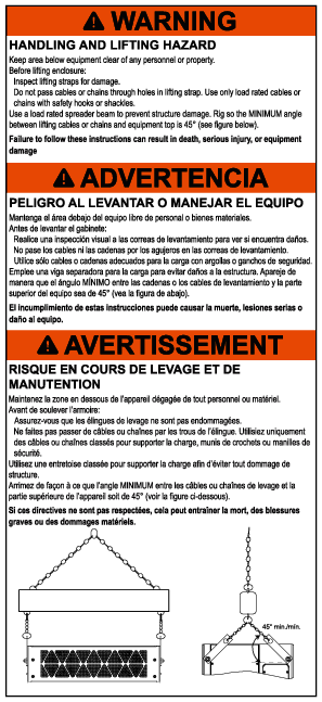 Los cáncamos de izaje no están incluidos en el subconjunto montado en zapatas o al aire libre. Use rodillos, eslingas u otros elementos para manipular estas secciones de transporte. La etiqueta de manipulación (vea Etiqueta de instrucciones de manejo - Tableros de distribución sin correas de levantamiento) viene adherida a cada una de estas secciones.