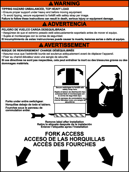 - Lea las etiquetas para el acceso de las horquillas en las secciones del tablero de distribución (vea Manejo con un montacargas ).