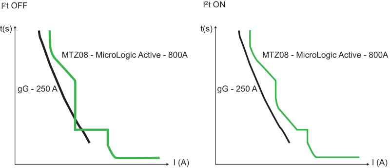 使用 I2t 反时曲线功能提高断路器协调性。当上游或下游安装了仅采用反时曲线的保护设备(如保险丝保护设备)时使用它。