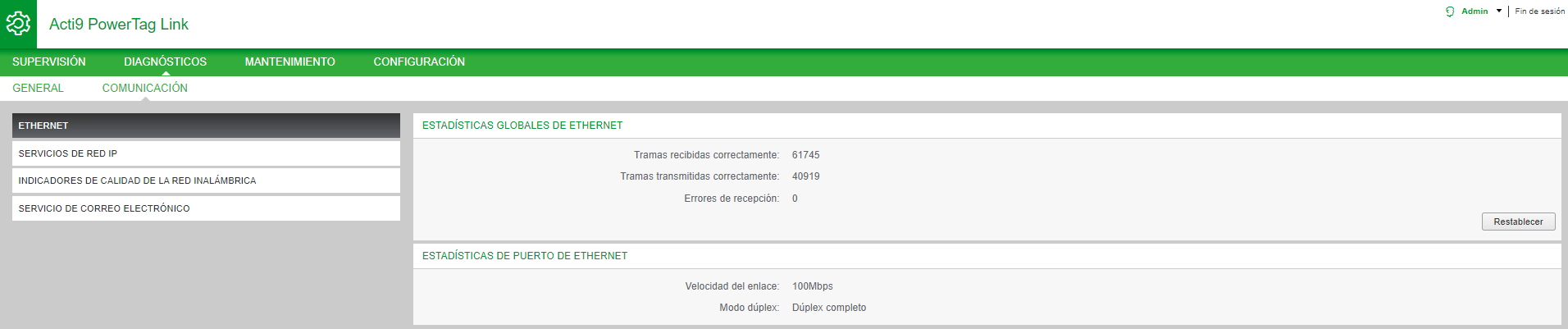 Haga clic en Restablecer para borrar los contadores de tramas Ethernet.