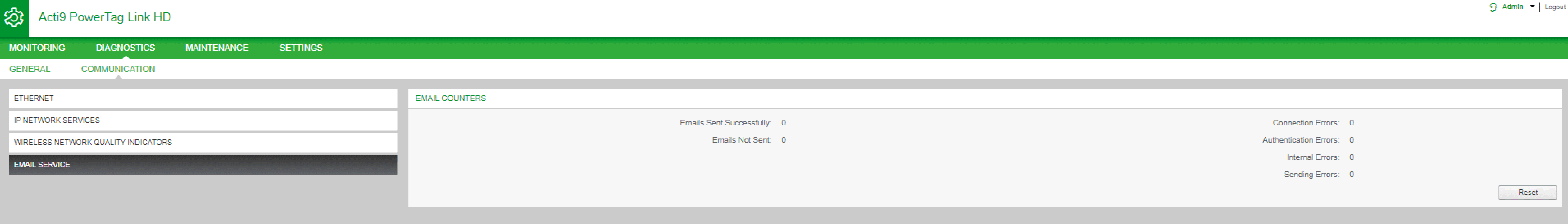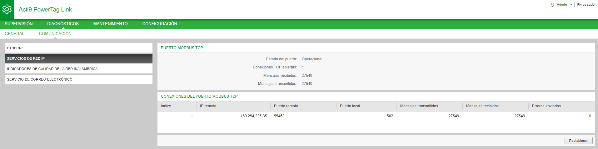 Haga clic en Restablecer para borrar el contador Modbus/TCP.