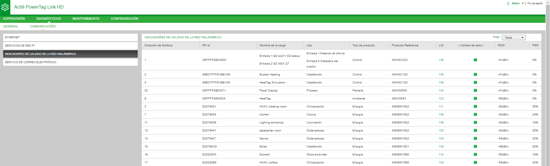 En la página se muestra información sobre la calidad de la red inalámbrica, como el indicador de calidad del enlace (LQI), el indicador de intensidad de la señal recibida (RSSI) y la tasa de error de paquetes (PER).