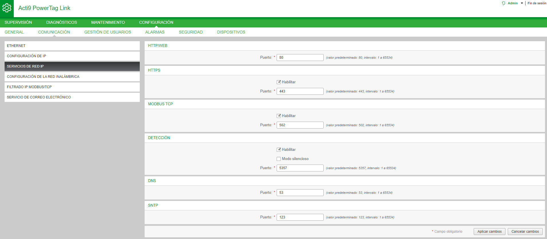 La pasarela PowerTag Link es compatible con HTTPS/HTTP, Modbus/TCP, DNS, SNTP y los servicios de detección.