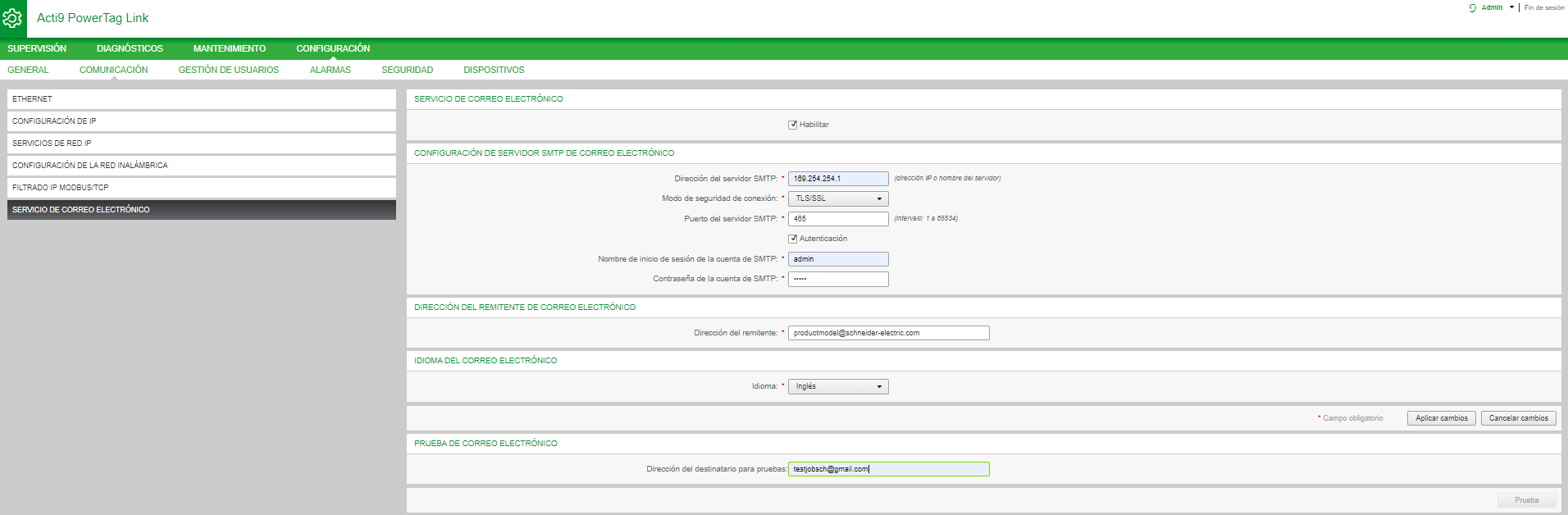 Haga clic en la casilla de verificación para configurar los ajustes del servidor de correo electrónico (opción habilitada de manera predeterminada). La pasarela PowerTag Link permite definir un servidor SMTP propio.