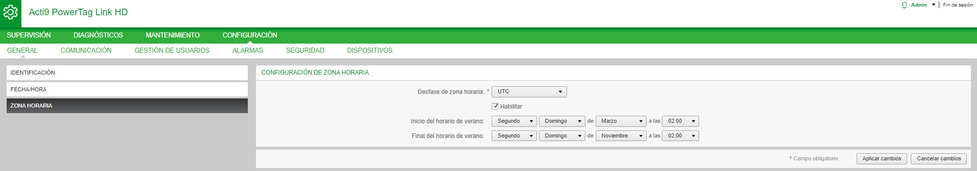 La página se utiliza para configurar el desfase y el horario de verano para la zona horaria seleccionada.