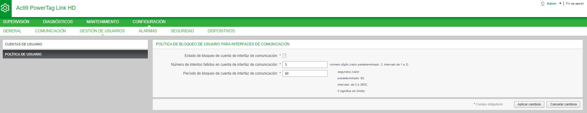 El administrador puede configurar el bloqueo de cuentas de la pasarela PowerTag Link. Esta función aumenta la seguridad de la pasarela al bloquear el acceso a la cuenta durante un periodo determinado en el caso de que se produzcan demasiados intentos no válidos de inicio de sesión.