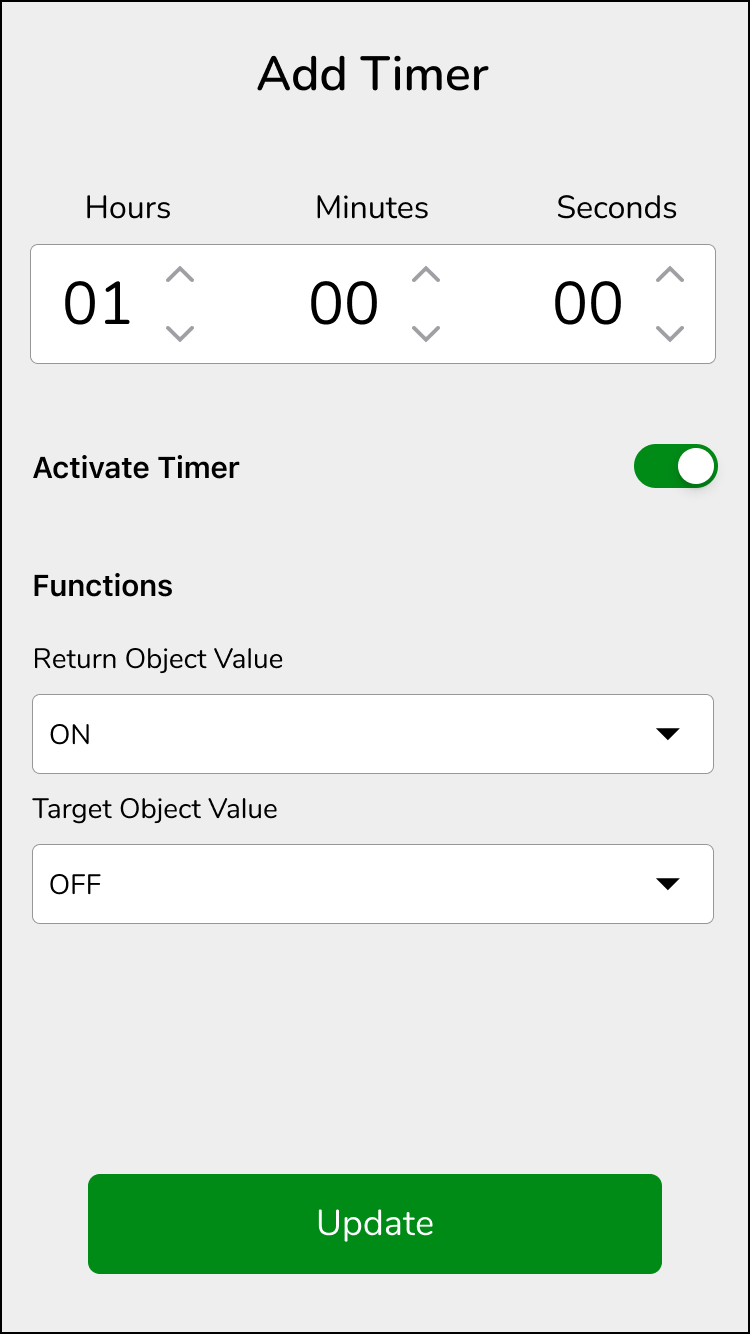 NOTE: You can activate or deactivate the Timer using the Activate Timer toggle switch, however, you cannot delete it. When de-activated, the Timer will no longer appear in the widget, and the widget will continue its normal operation, such as turning On or Off. -