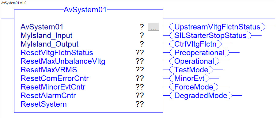 El bloque de funciones AvSystem devuelve el estado de los datos cíclicos de diagnóstico y energía del avatar del sistema y los restablece.