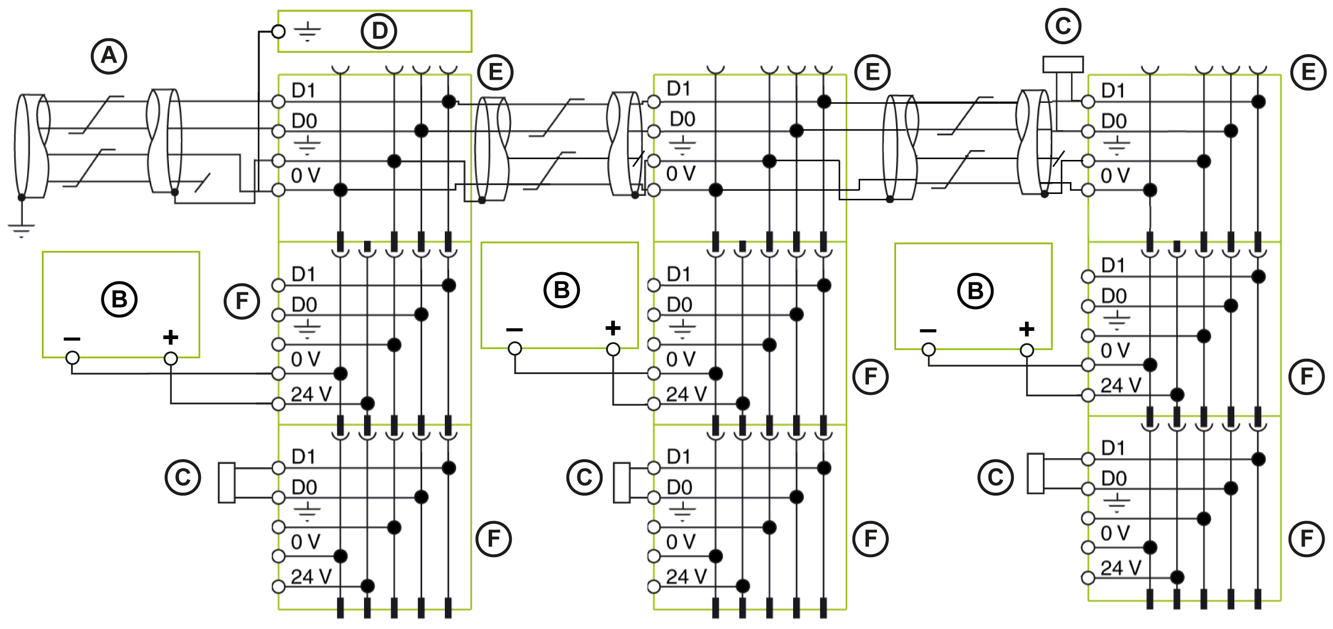 En la figura siguiente se muestra una conexión Modbus entre tres equipos eléctricos S1 , S2 y S3 a través de módulos repetidor aislado RS 485 de 2 hilos : En este ejemplo, el terminal Modbus de 0 V debe estar conectado al cliente Modbus por un solo punto de la línea Modbus, y ningún otro dispositivo debe tener 0 V conectados a tierra.