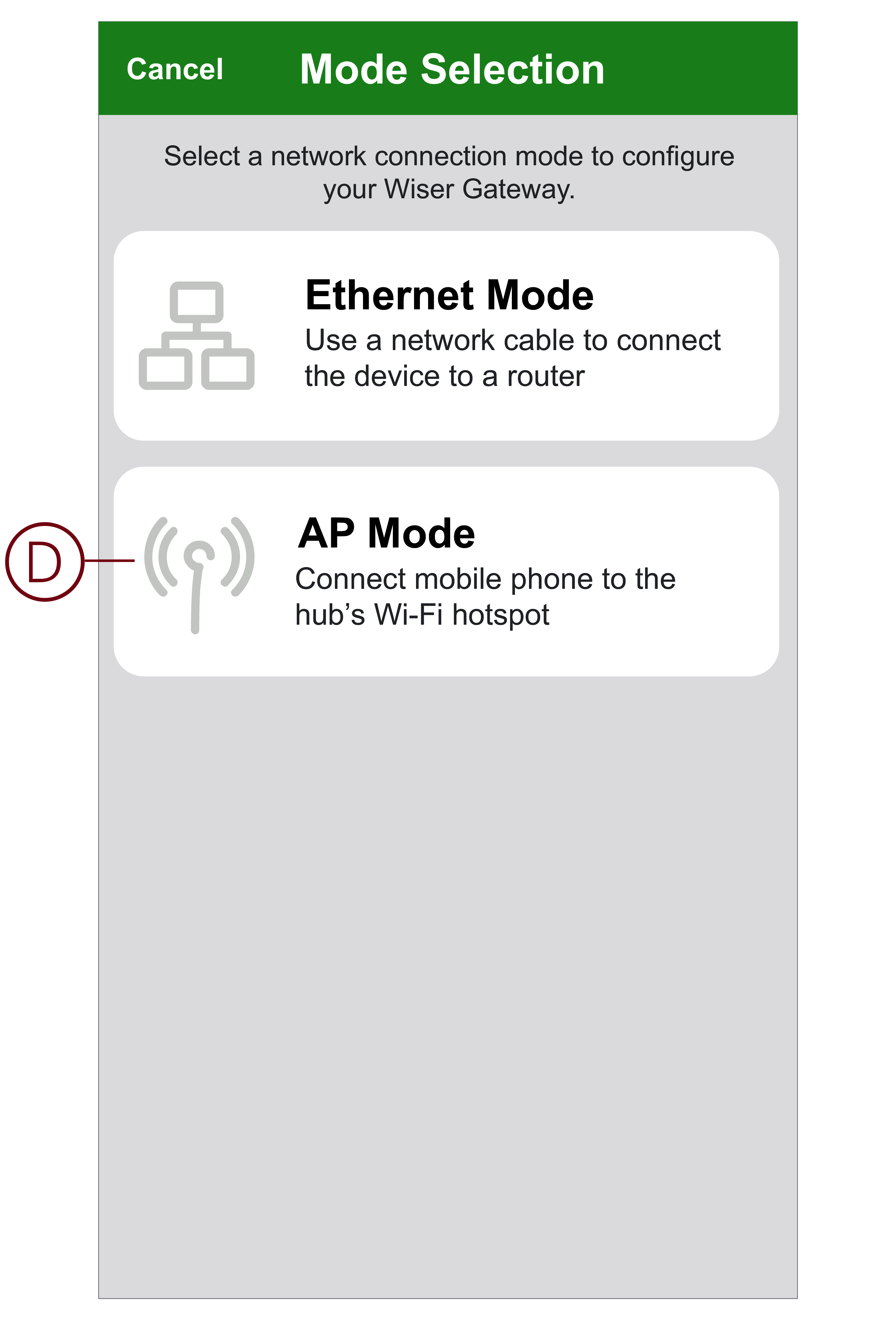 - Upon selecting Basic Hub, you will receive option to select the modes of commissioning the Basic Hub. Select Connect with WiFi for commissioning (See D).