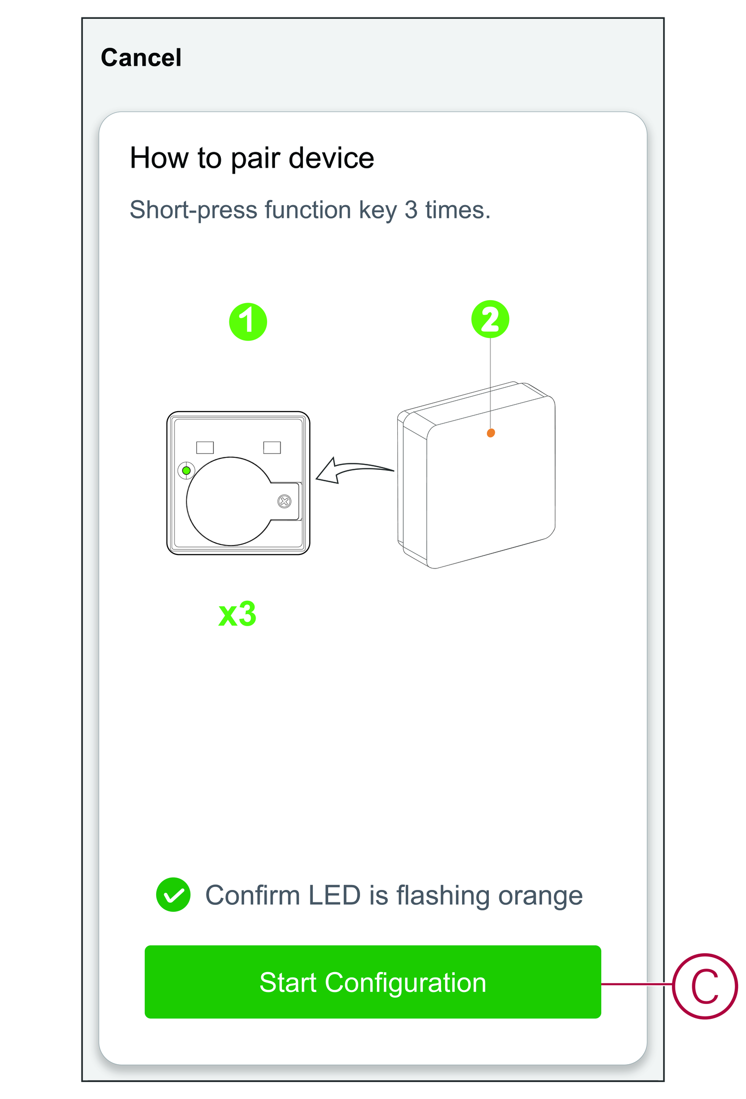 7. In the app, select Confirm LED is flashing orange and tap Start configuration (C).