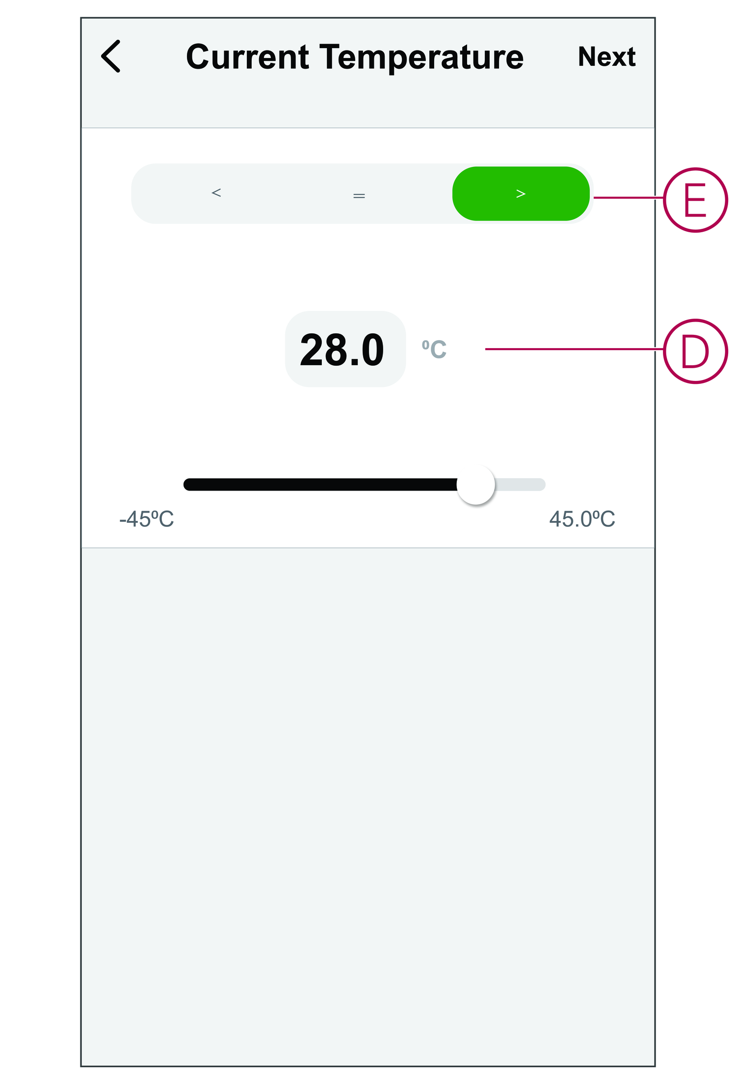 • Current temperature - Set the temperature (D) and select the condition (E)
