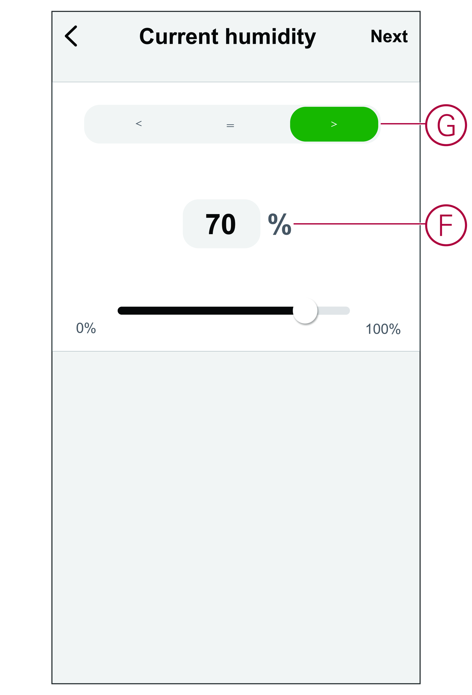 • Current humidity - Set the humidity (F) and select the condition (G)