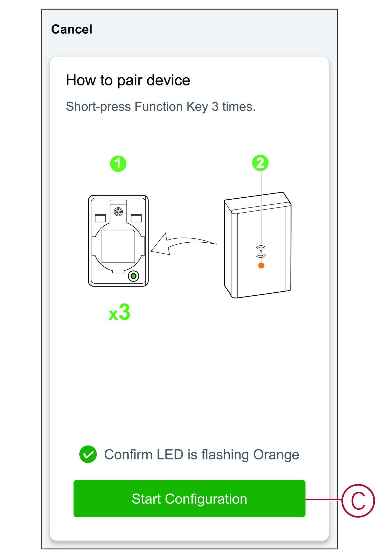 7. In the app, select Confirm LED is Flashing Orange and tap Start Configuration (C).