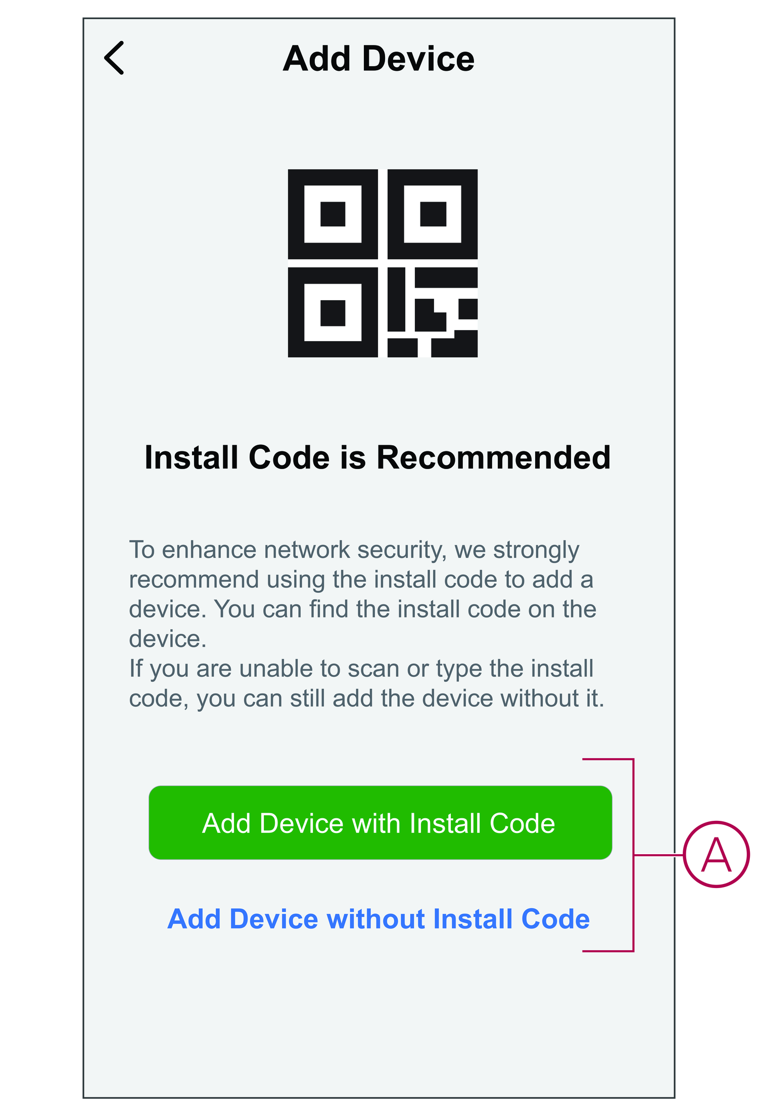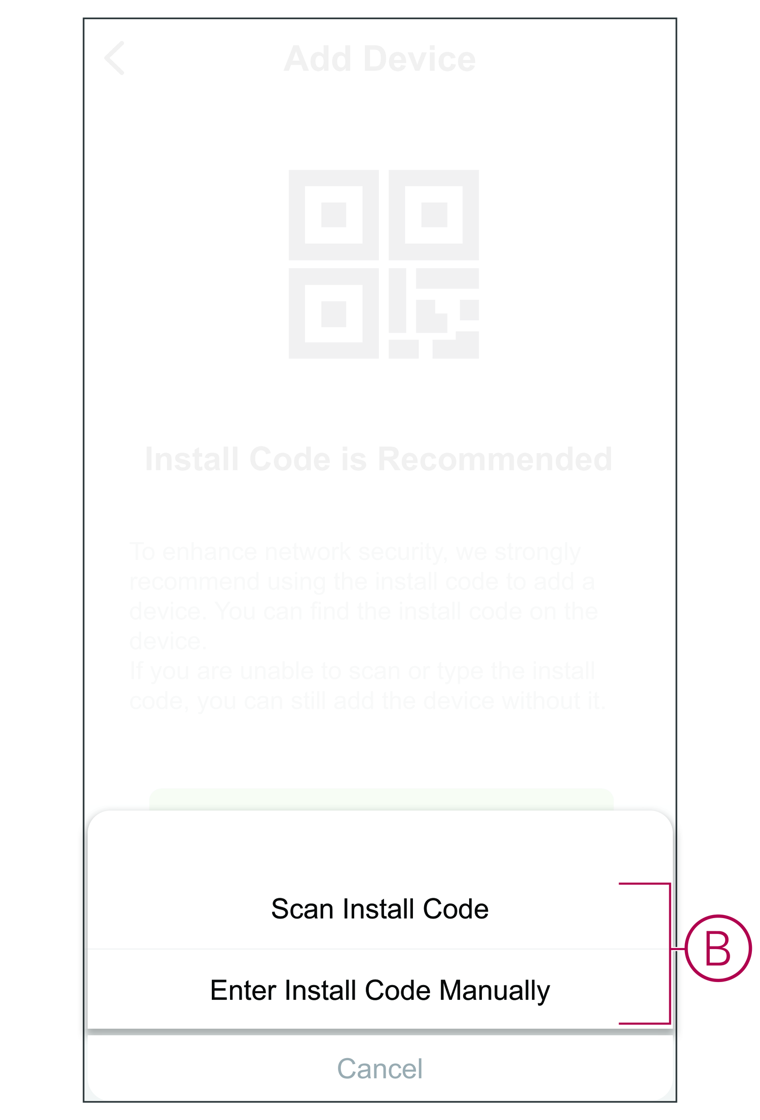 4. To pair the device with an install code, tap Add Device with Install Code to display the slide-up menu. Select any one of the options (B):