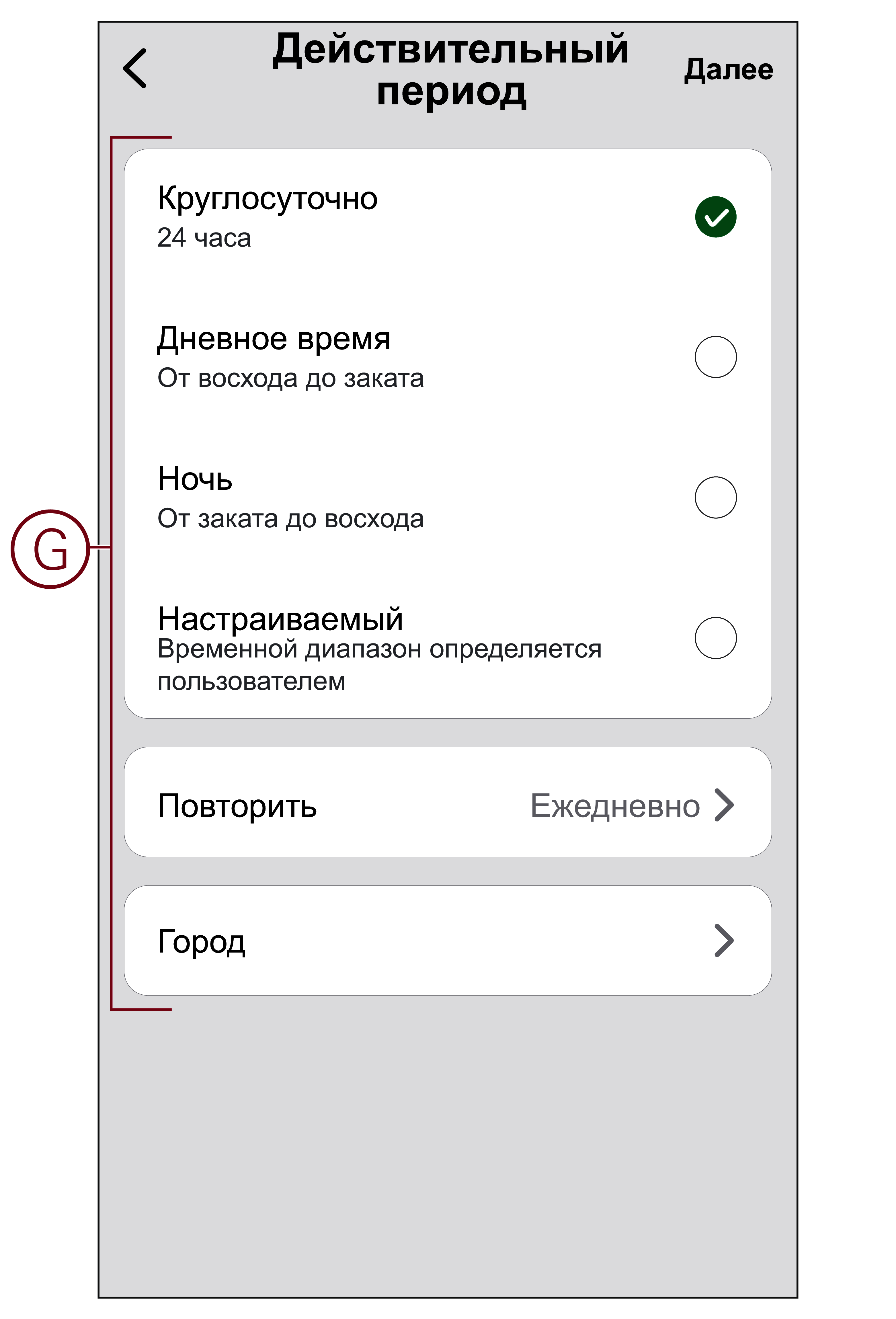 10. Нажать на Действительный период, чтобы установить временной диапазон для режима автоматизации. Можно выбрать один из следующих вариантов (G):
