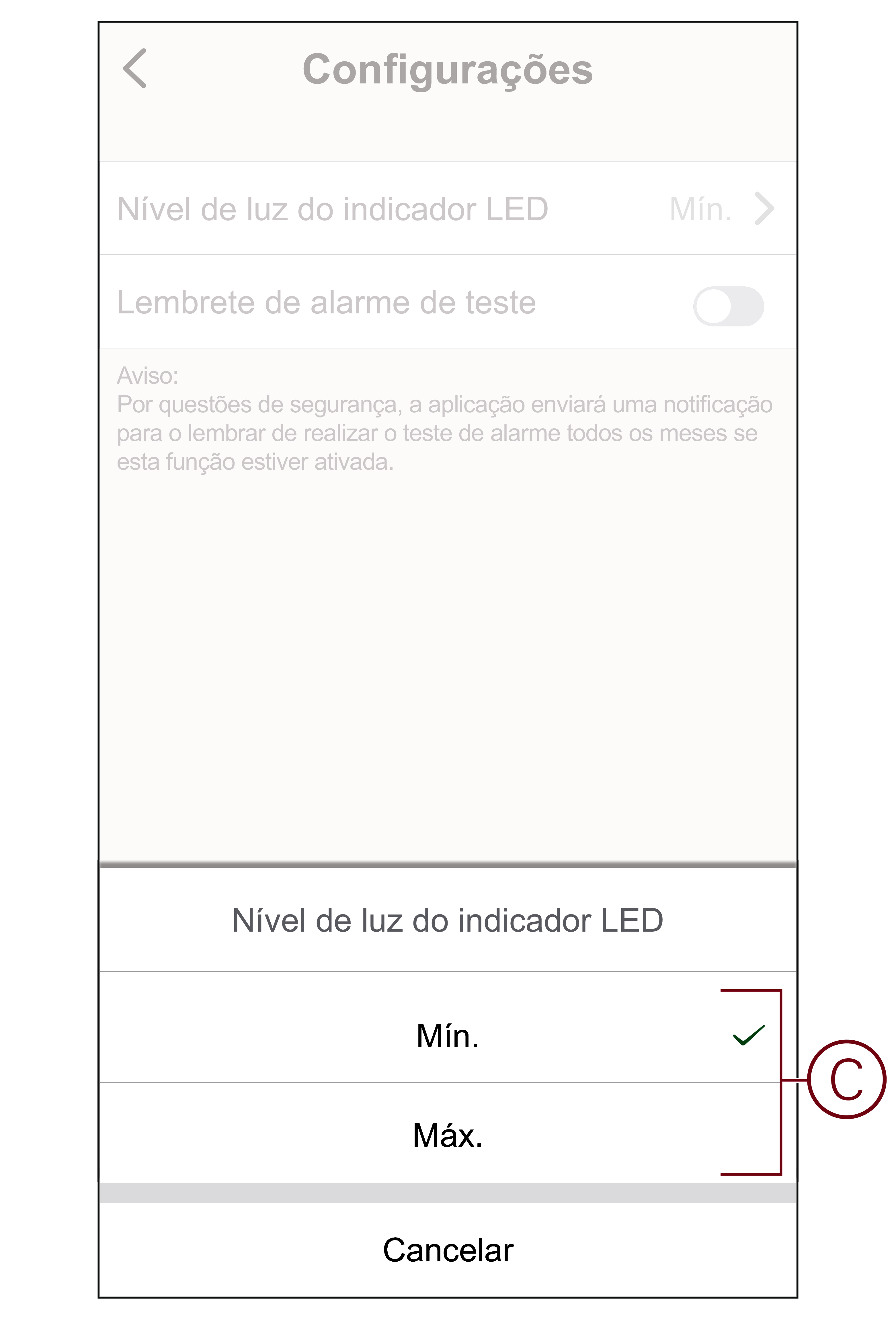 Quando o LED vermelho estiver ligado, pressione o botão Test/Hush para alternar entre Min. e Max. Luminosidade do LED.