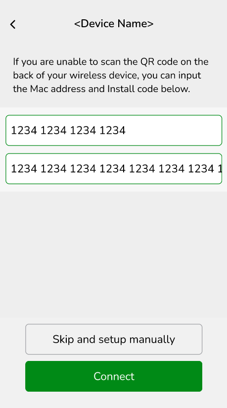 the QR code, enter the MAC Address and Install Code, and then tap Connect.The Wiser Home app verifies as Confirmed if the MAC Address and Install Code are valid.NOTE: If the MAC Address and Install Code are not visible, you can manually pair it by tapping Skip and setup manually.